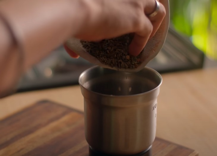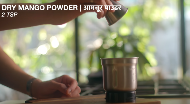 After taking it out, we will let it cool down a bit and then we will put it in a grinder mixer and add 2 teaspoons of mango powder, 1 teaspoon chaat masala and a little salt and make it into a coarse powder. We do not want to make a fine powder of it. We have to make it coarse.