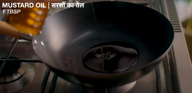 First of all, we will put a pan on the gas and put 1 teaspoon mustard oil in it and then heat it well.