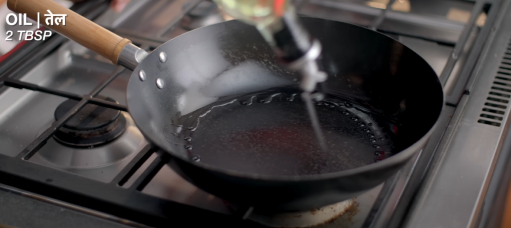 Step 8: To make the sauce for Vegetable Manchurian Dry, first of all we will put a vessel on the gas and add 2 teaspoons of oil in it and heat it well.