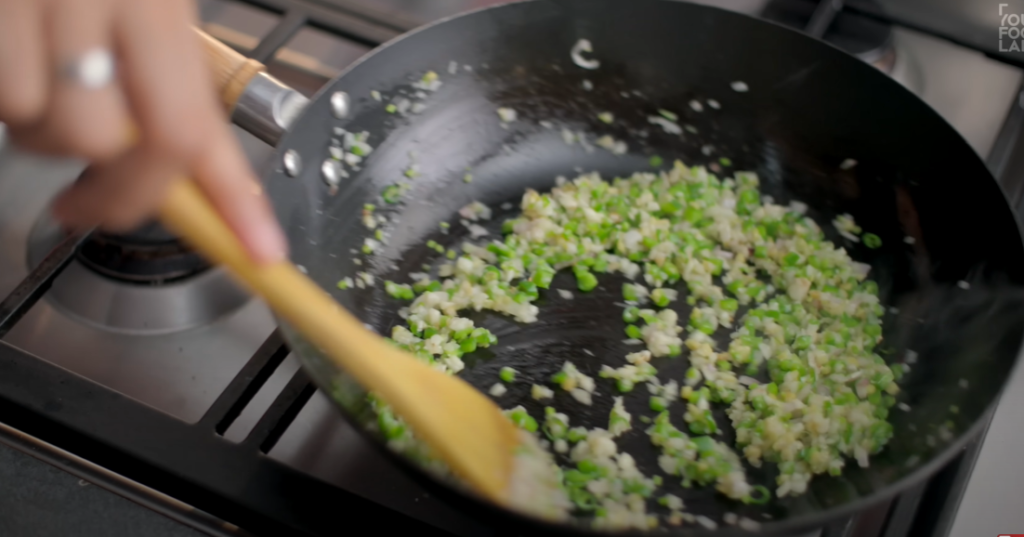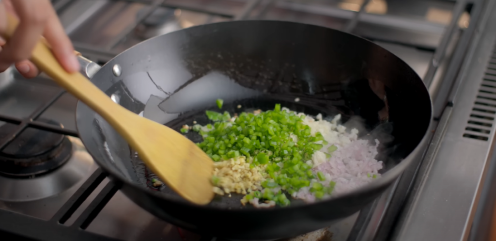 After the oil is heated well, we will add 2 teaspoons of chopped onion along with 4 teaspoons of chopped garlic and 1 teaspoon of chopped ginger along with 1 teaspoon of chopped coriander stalk and 1 to 2 chopped green chillies and 2 teaspoons of chopped capsicum and cook it well on high flame for 1 minute.