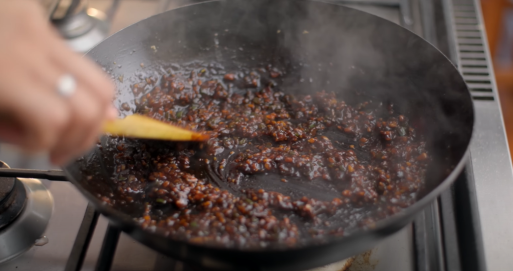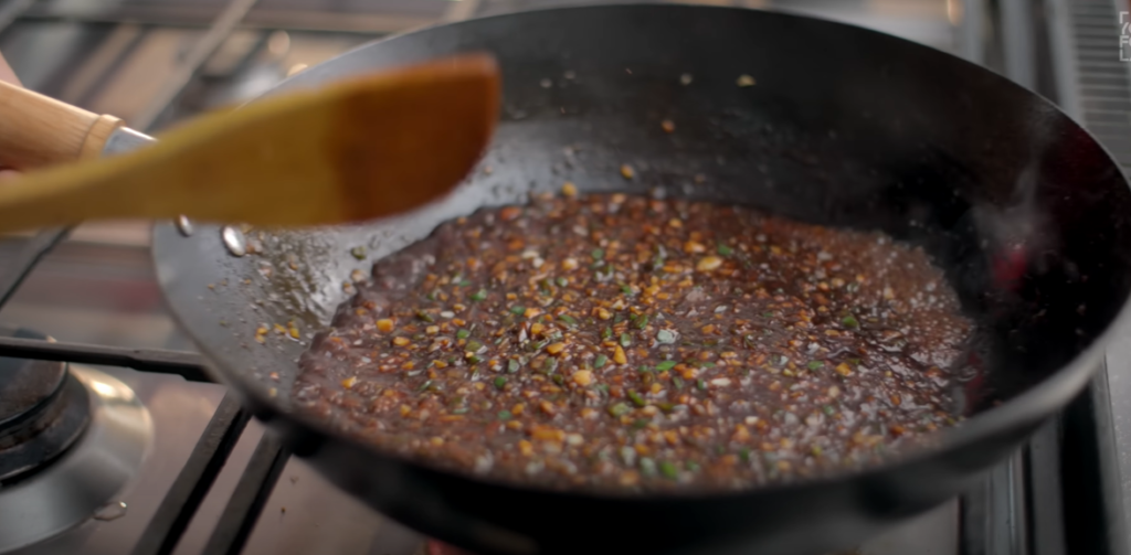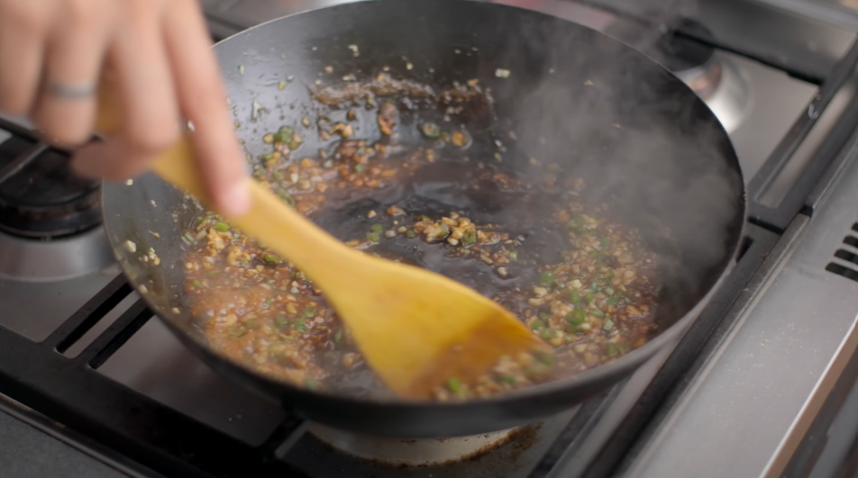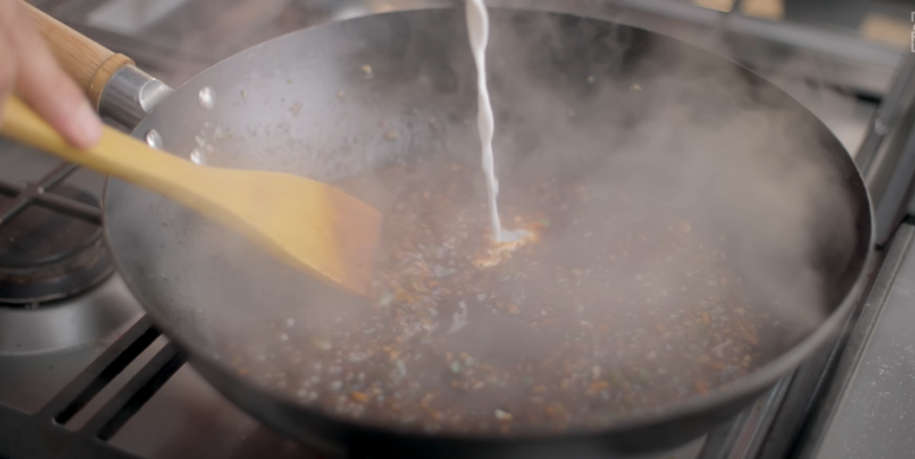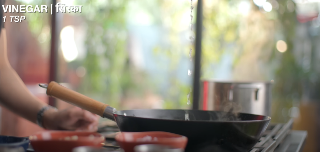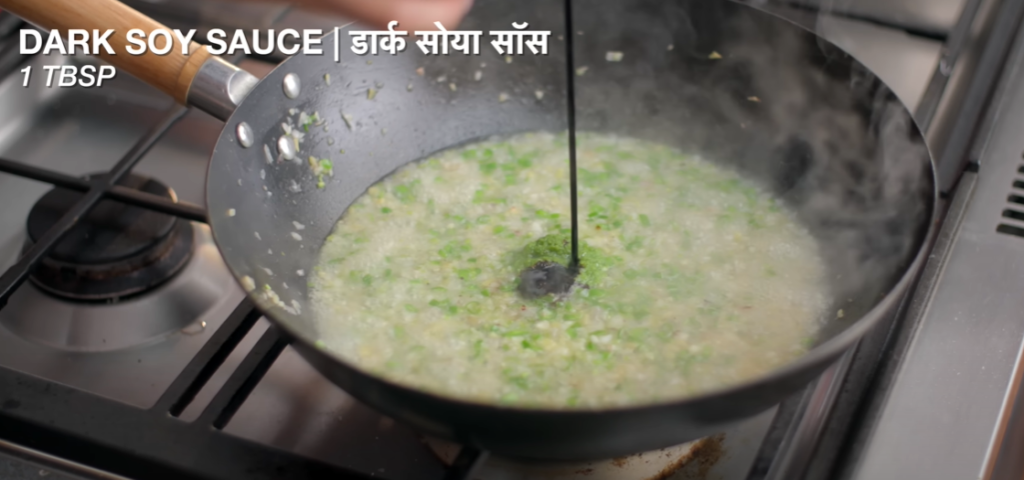 Step 9: After cooking for 1 minute on high flame, add 100 to 150 ml water and 2 to 3 teaspoons green chilli paste, 1 teaspoon dark soya sauce, 1 teaspoon vinegar, a little white pepper powder and salt as per taste and cook it well for 3 to 4 minutes.