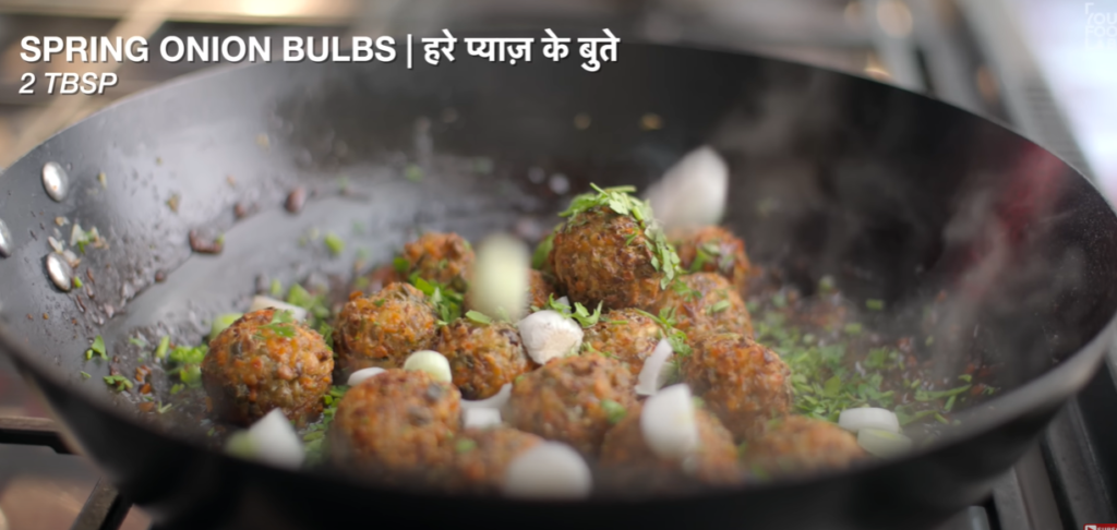 After the sauce becomes a little thick, we will put the gas on low flame and add fried Manchurian in it, along with chopping some white onion, we will also chop the green onion and add it and mix it well quickly, do not cook it